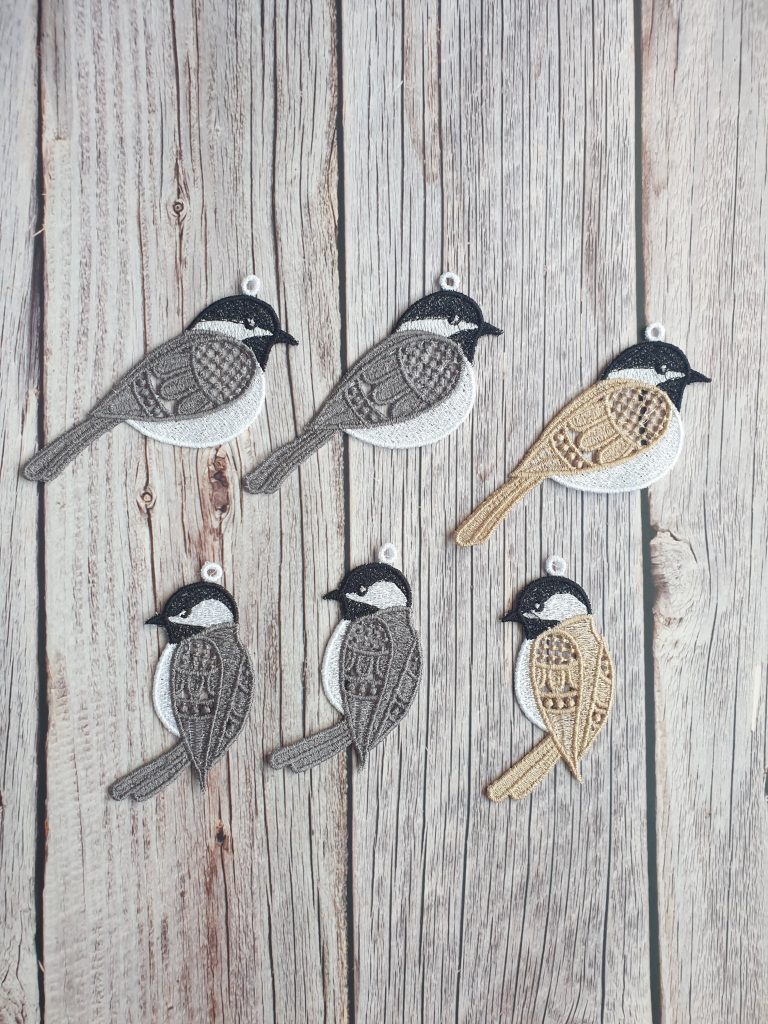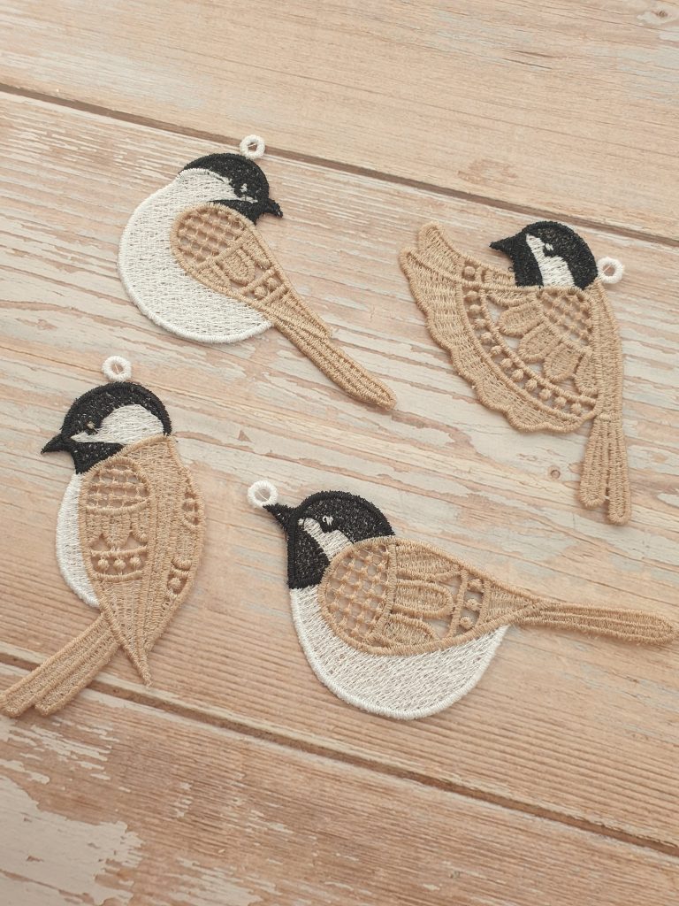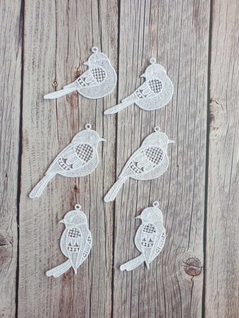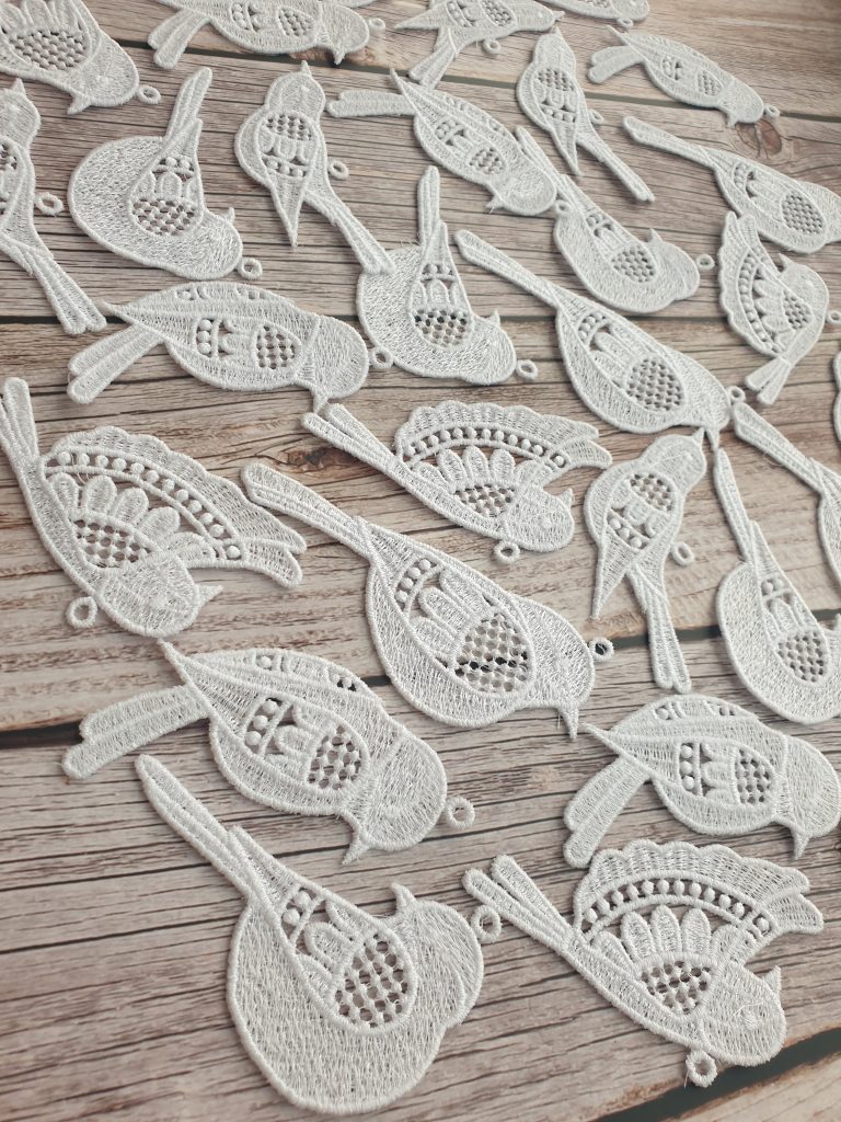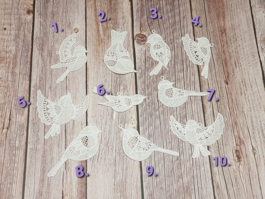 Krajková výšivka ptáčků různé velikosti. Mají očko z k zavěšení například na větvičku. Barevné kombinace ptáčků si můžete sami zvolit.