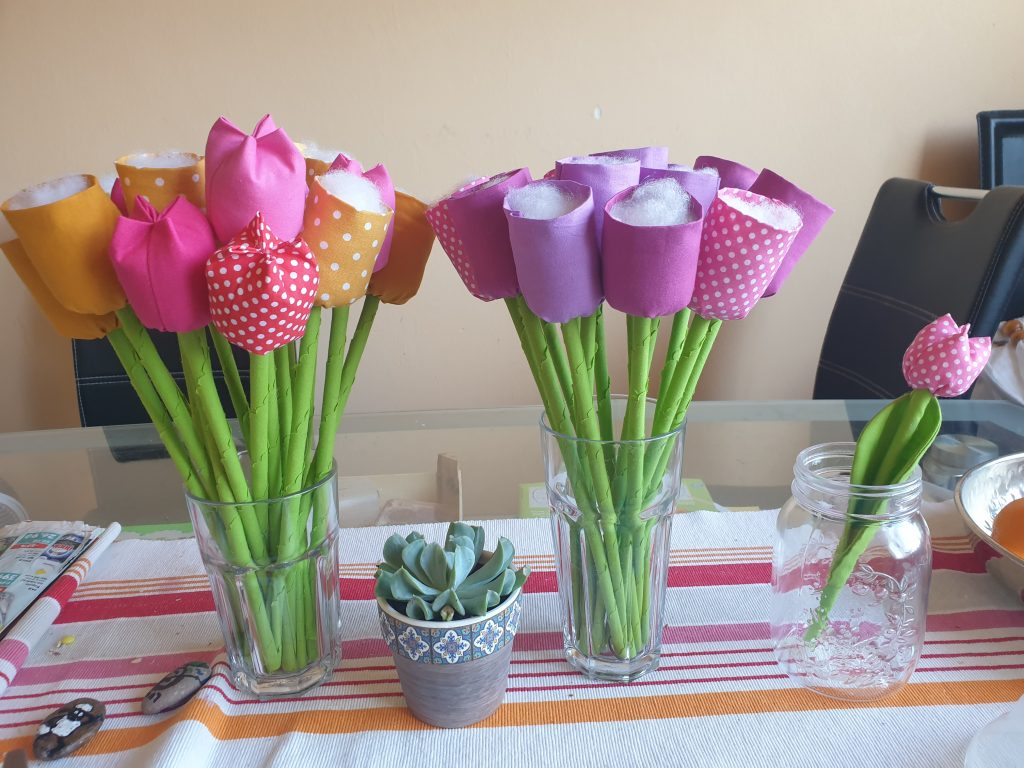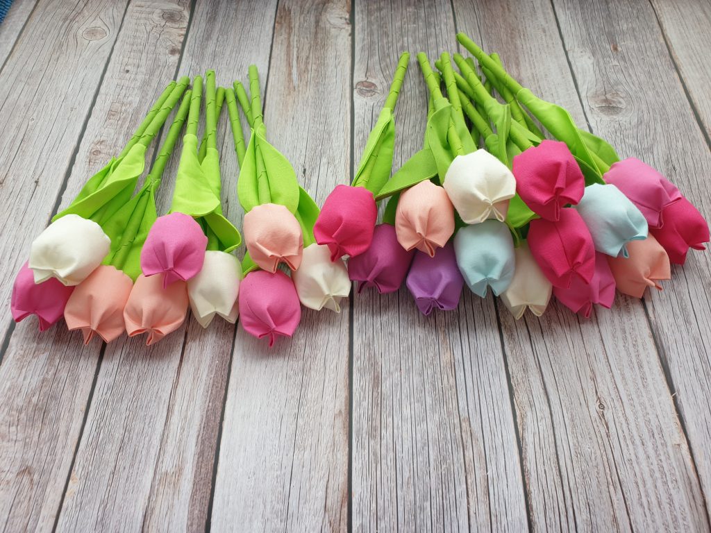 Látkové šité tulipány. Vypadají krásně na stole ve váze ale pozor, nepotřebují vodu a nikdy Vám neuschnou. Tulipánky mohou být jaké dárkem k narozeninám, svátku, dni matek nebo třeba Valentýnu. Mohou být ale také jako výzdoba v domácnostech kam často nejezdíme ale po příjezdu chceme aby bylo místo útulné například chata nebo chalupa.
